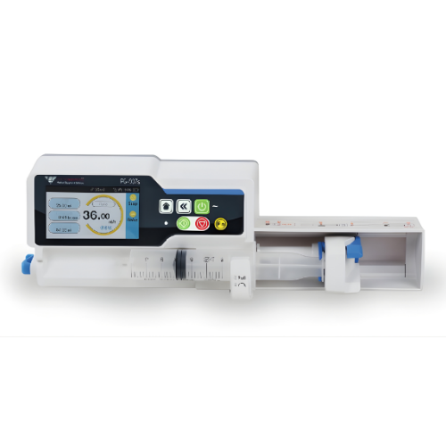 Display interfaz de usuario de pantalla táctil de 4,3″ LCD y fácil y ajusta a las normas IEC 60601, de alta seguridad con doble CPU Identificación automática de la jeringa 5, 10, 20, 30, 50/60 ml Función de Control de Motor contra inversión