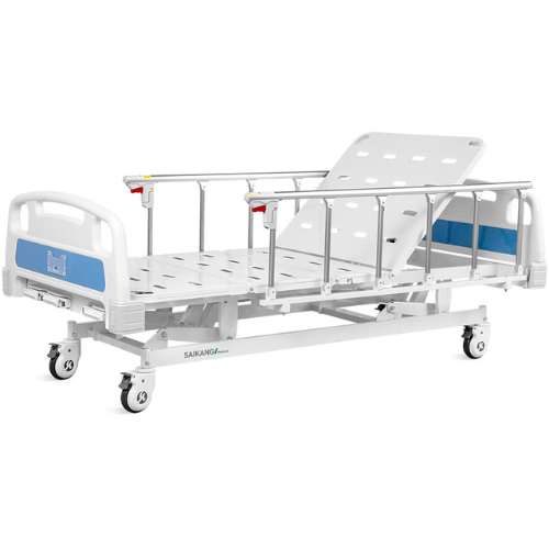 Cama manual de 3 funciones, estructura fabricada en acero y ABS en cabecera y piecera, con acabado en pintura epoxica y antibacterial. Cuenta con freno en todas sus ruedas, 3 manivelas para el cambio del posicionamiento de fácil acceso para el clínico, barandas plegables con seguro de posicionamiento. Permite ajustar altura, ángulo del respaldo y rodillas.