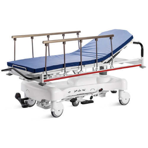 Camilla de transporte de pacientes, con barandas plegables para ahorrar espacio. Cuenta con porta suero de 4 ganchos, soporte para tubo de oxigeno, asas de transporte y freno centralizado. Permite ajustar la angulación del respaldo asistido por pistones de gas, la angulación de las rodillas de forma manual y la altura de la camilla por 2 bombas hidráulicas. Cuenta con pedales para el control de los movimientos a ambos lados de la camilla. Colchoneta impermeable fácil de limpiar, con espuma de alta densidad.