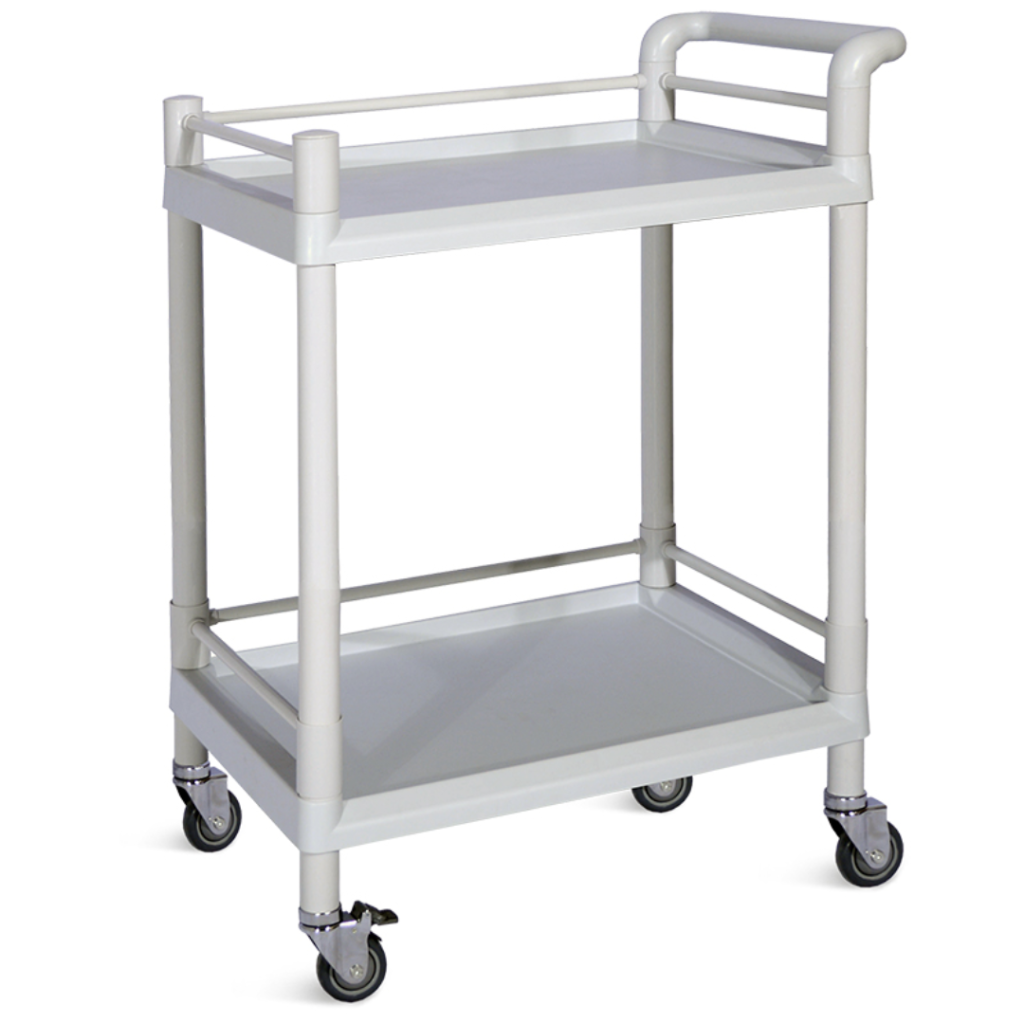 Carro utilitario o de procedimientos de 2 bandejas con estructura de ABS y rieles de seguridad en 3 de sus lados para evitar la caída de objetos u insumos durante el traslado. Cuenta con 4 ruedas silenciosas doble cara para facilitar el traslado, dos de ellas con freno.